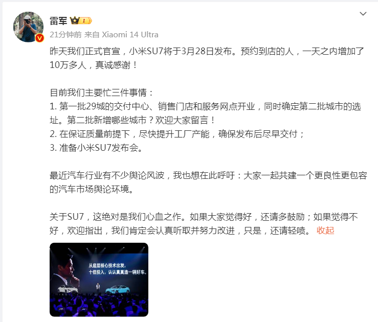 3月13日,小米集团董事长雷军发布微博称,官宣小米SU7将于3月28日发布。预约到店的人,一天之内增加了10万多人。雷军表示,目前主要忙三件事情:1.第一批29城的交付中心、销售门店和服务网点开业,同时确定第二批城市的选址。2.在保证质量前提下,尽快提升工厂产能,确保发布后尽早交付。3.准备小米SU7发布会。