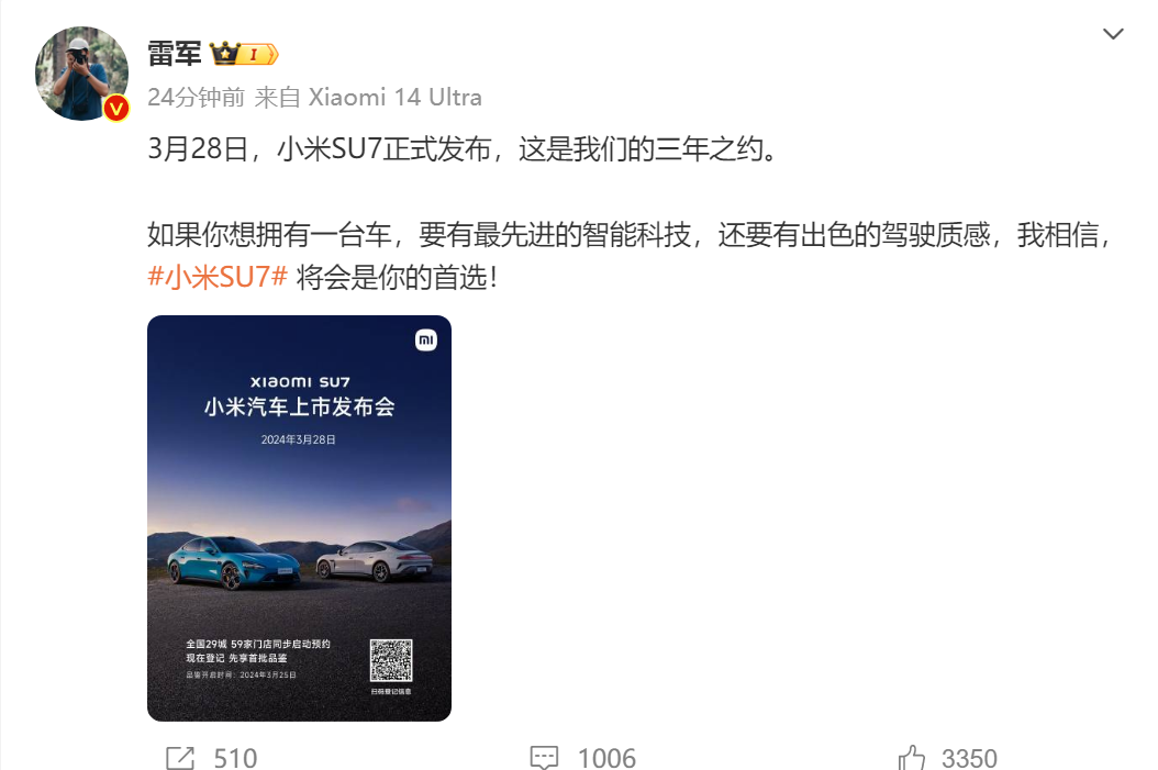 3月12日,雷军发布微博称,“3月28日,小米SU7正式发布,这是我们的三年之约。”小米汽车官方微博称,上市即交付,交付即上量。