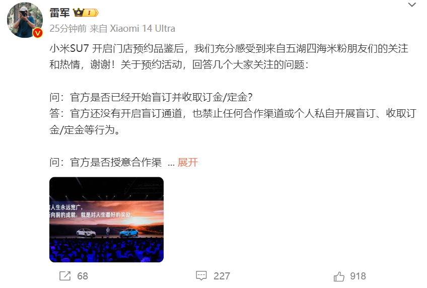 3月14日,小米集团董事长雷军在微博发布消息称,小米SU7官方还没有开启盲订通道,也禁止任何合作渠道或个人私自开展盲订、收取订金/定金等行为。官方禁止对预约品鉴、试驾等行为收取订金/定金,同时禁止收集与试驾邀约无关的个人信息。为了确保现场体验,我们会采取预约排队等方式。发布会前,官方不会通过任何渠道宣贯产品定价和销售权益。
